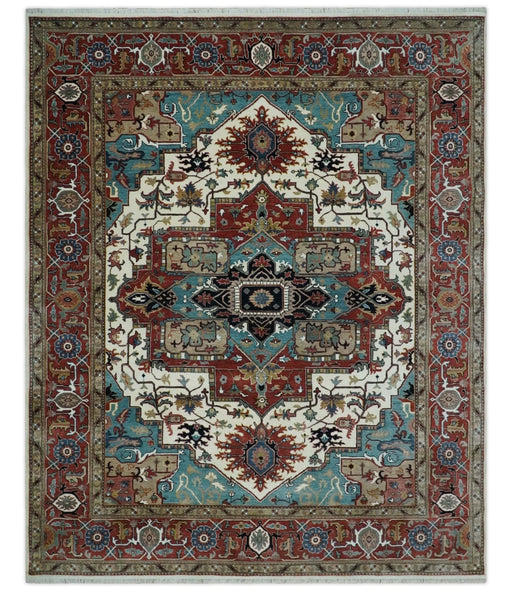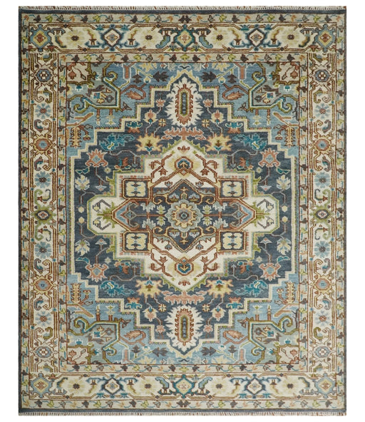 View full detailsThis 8x10 traditional Heriz Serapi wool area rug features a classic ivory, blue and rust color palette, skillfully hand-knotted to create an elegan...