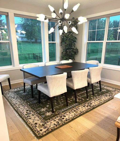 View full detailsThis luxurious rug radiates elegance with its deep, verdant green backdrop accentuated by intricate floral motifs in soft blue and cream hues. The ...