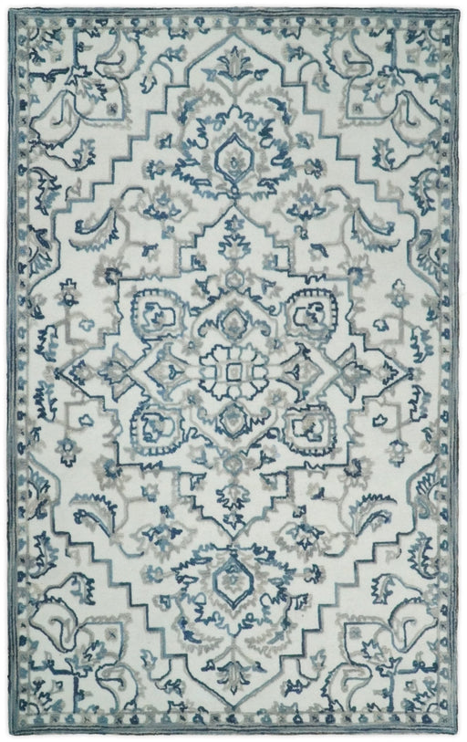 View full detailsThis Hand-Hooked Area Rug has been made with fine wool. The Heriz-inspired medallion design is shaded blue and silver color on the white canvas giv...