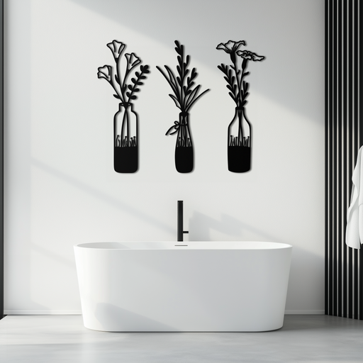 Enhance your living space with the Rustic Floral Bottle Metal Wall Art, a beautifully crafted steel décor piece featuring three delicate vases f...