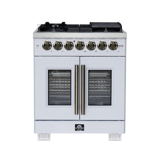 View full detailsThe Forno Capriasca 30 Inch French Door Dual Fuel Range in white with antique brass accessories brings professional-grade style and performance int...