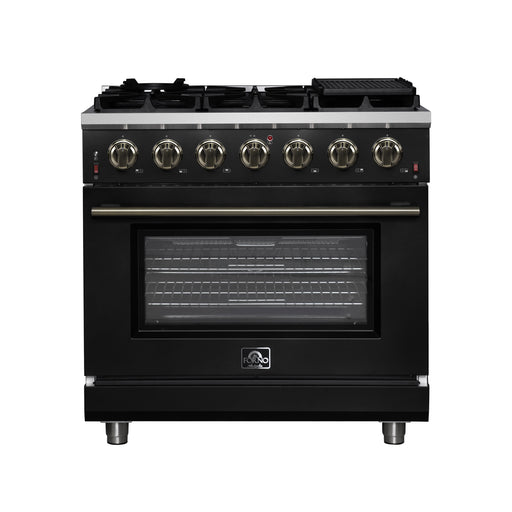 View full detailsThe Forno Capriasca 36 Inch French Door Dual Fuel Range in black with antique brass accessories brings professional style and high performance cook...