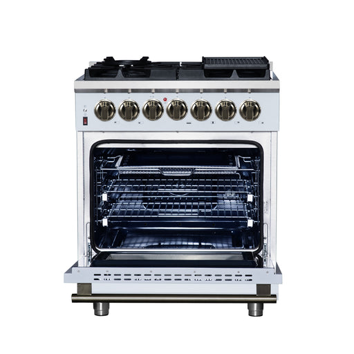View full detailsThe Massimo 30 Inch Dual Fuel Range in White with Antique Brass Accessories blends professional performance with modern design. The cooktop feature...