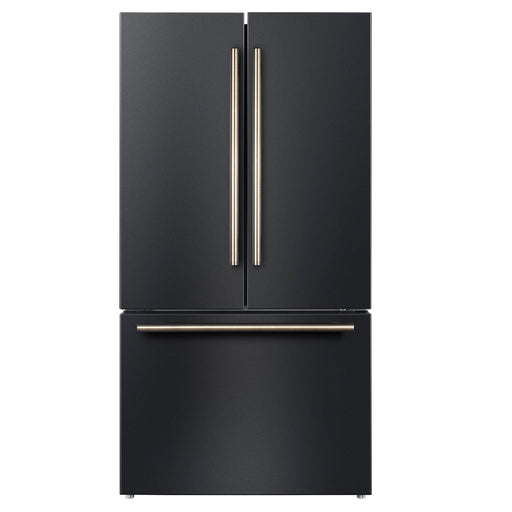 The Rivello 36 Inch French Door Refrigerator in Black with Antique Brass handles offers spacious, energy-efficient cooling with a bold, smudge-resi...