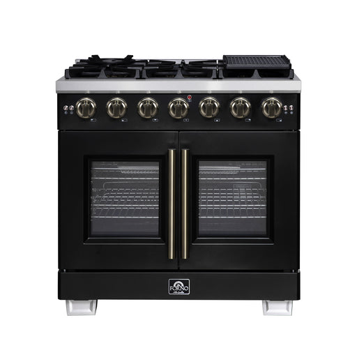 View full detailsThe Forno Capriasca 36 Inch French Door Dual Fuel Range in black with antique brass accessories brings professional style and high performance cook...