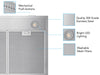 The Victory Classic comes with a 600 CFM rust/oil-resistant, all metal, fully enclosed motor and a high temperature (600C) fiberglass sleeve for all wires making it one of the most reliable motors on the market. The stainless steel chimney cover also accommodates 8'-9' ceilings (with an option for 10' ceilings) to fit most kitchens.