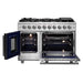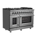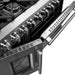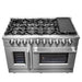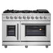The Massimo 48 Inch French Door Gas Range delivers professional style and durability to your home kitchen with its robust stainless-steel design. The rangetop features 8 sealed burners, 107,000 BTU output which one is a 20,000 BTU dual-ring brass burner that can reach a simmer of 1,000 BTU for precise simmering. Continuous cast iron grates ensure stability over the enamel cooktop cavity, making spills easy to clean. The 6.58 cu.ft. combined oven capacity delivers a total output of 44,000 BTU, encased in a speckled blue enamel interior for easy maintenance. The 3-layer glass oven door window provides heat retention and a clear view. The main oven, with a 4.32 cu.ft. capacity and convection fan, enhances cooking efficiency. Included are 4 telescopic oven racks, wok support, two griddles, air-fryer kit with drip pan, and an LP conversion kit. Housed in a high-grade stainless steel body with illuminated zinc knobs, the Massimo offers a stylish, long-lasting addition to your kitchen.