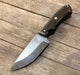 This Bushcraft style blade is made from 80CRV2 high carbon steel and has a scandi grind with stone wash patina. Canvas micarta and orange G-10 make up the handle which is attached with brass fittings and a .22 shell casing. Blade length is 4” and overall is 8 3/4” - sheath included.