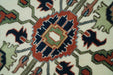 This fine hand-knotted traditional Heriz rug features a beautiful color combination of rust, ivory, and blue. Made from 100% wool, this 9x12 area rug adds warmth and sophistication to any room. Invest in a timeless piece of craftsmanship with this exquisite rug.